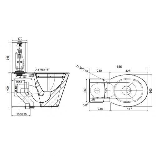 Длина унитаза 655 мм. Нижний подвод воды к бачку.