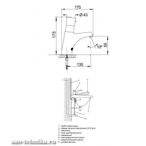 вода выключается после изъятия рук из зоны чувствительности, время задержки выключения воды возможно настрoить в диапазону 0,25 - 7,75 сек.