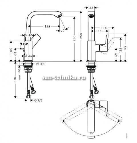 *Смеситель для раковины Hansgrohe Metris 31087000 - ComfortZone (высота, создающая пространство между изливом и умывальником): 230 мм - выступ 155 мм - обычная струя - расход воды: 5 л/мин - сливная арматура со стержнем тяги - подходит для проточных водонагревателей - угол поворота излива 120°