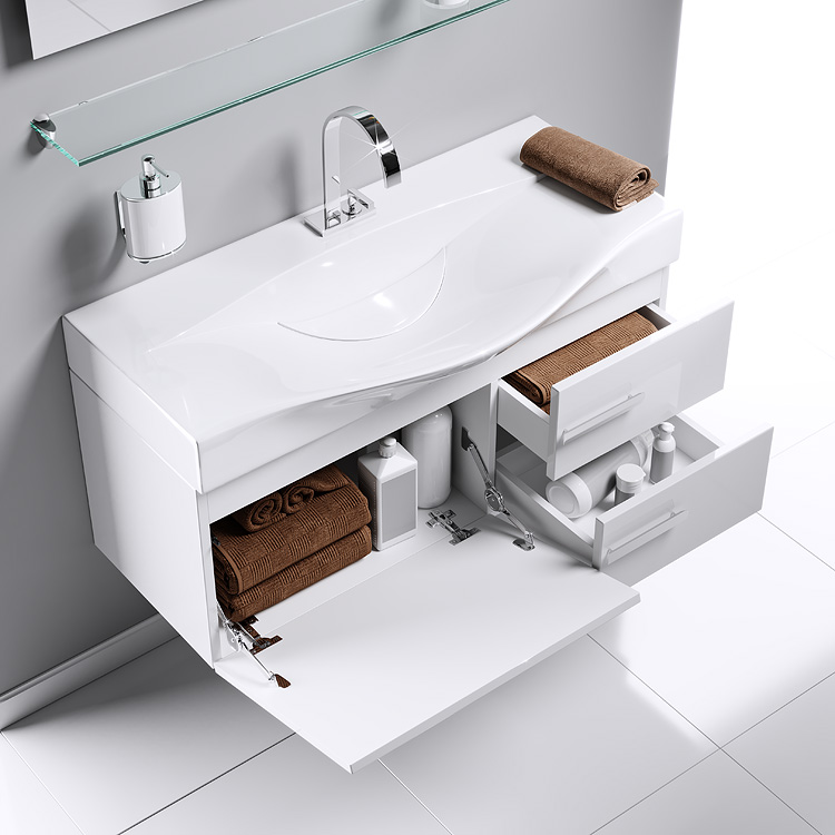 Фасадные и боковые части мебели изготовлены из высококачественного испанского МДФ концерна FINSA. Модель имеет два ящика с системой плавного закрывания австрийской фирмы BLUM и дверь, с системой барного открывания. В зеркальную панель встроена люминесцентная подсветка с эффектом фонового освещения. На все элементы установлены системы плавного закрывания. Модель дополняется двумя универсальными (правыми/левыми) подвесными пеналами 25 и 35 см, стеклянной полкой.
