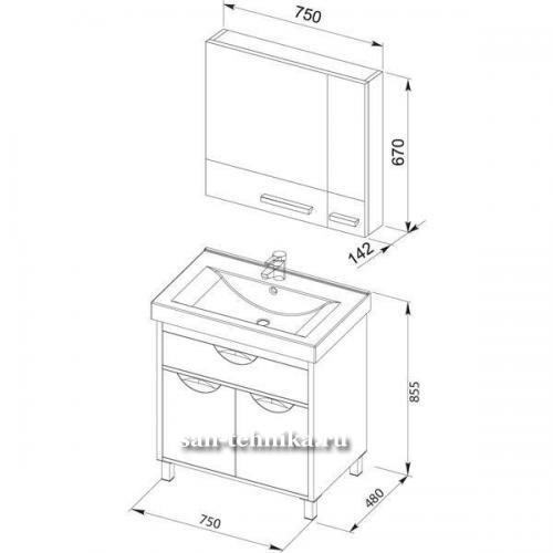 Состав комплекта: - зеркало - раковина (монораковина, фаянс) - тумба Размеры тумбы c раковиной (ШxВxГ): 750х855х480 мм Размеры зеркала (ШxВxГ): 750х670х142 мм Размеры раковины: (ШxВxГ): 750х450 мм Размеры пенала: (ШxВxГ): 400x1950x320 мм Материал: МДФ, ДСП *Подробней пеналы Гретта можно посмотреть здесь