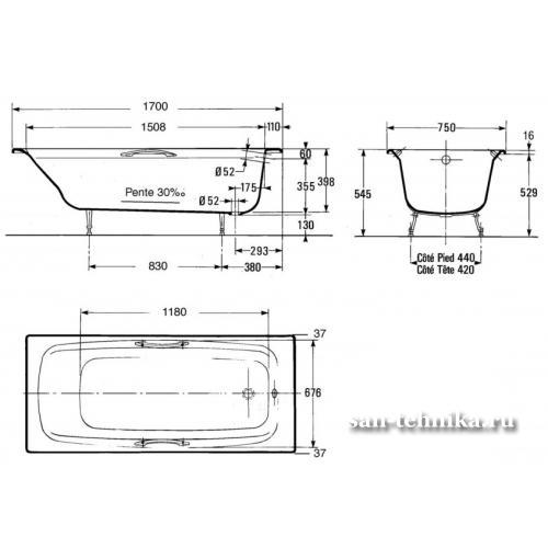 * арт. E2926-00 - Чугунная ванна с отверстиями для ручек - цвет: белый - объем воды: 100 л (до переполнения) - дно с антискользящим покрытием - cпинка с двойным изгибом - дека для смесителя и слив расположены со стороны ног