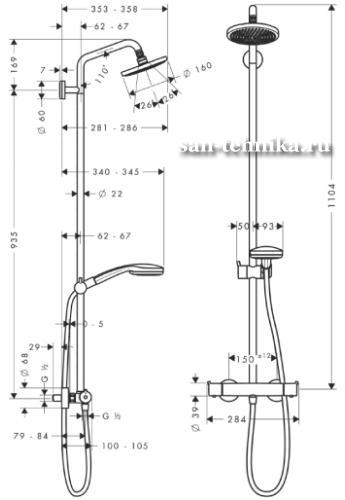 Душевой комплект термостат с запорным/переключающим вентилем Ecostat S, ВМ и переключатель для ручного душа верхний душ Croma 160 EcoSmart (27450000) защита от загрязнений QuickClean ручной душ Croma 100 Vario EcoSmart (28537000) шланг Isiflex 1,60 м, m (28276000) регулируемый по высоте держатель душа прокладка для крепления штанги на плитку 7 мм (95239000)
