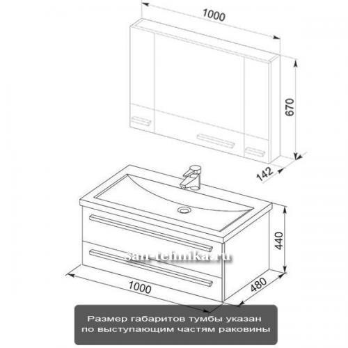 Состав комплекта: - зеркало-шкафчик - светильник - раковина-столешница (литьевой мрамор) - тумба: 2 выдвижных ящика с механизмом плавного закрывания Размеры тумбы (ШxВxГ): 992х400х475 мм Размеры зеркала (ШxВxГ): 1000х670х142 мм Размеры раковины: (ШxВxГ): 1000x40x480 мм Размеры пенала: (ШxВxГ): 400x1600x366 мм Материал: МДФ, ДСП *Подробнее пеналы Нота можно посмотреть здесь