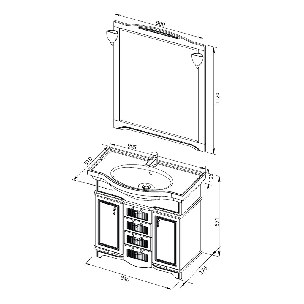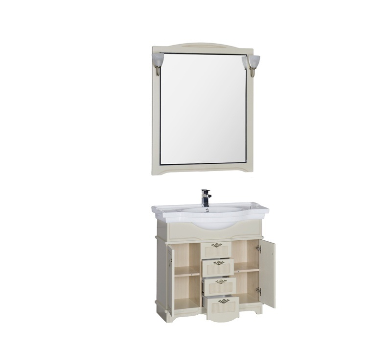 Комплект мебели для ванной комнаты в классическом стиле Акванет Луис 90 представлен напольной тумбой с оригинальным декором и массивным навесным зеркалом. Для хранения банных принадлежностей в тумбе предусмотрено два больших отделения с распашными дверцами и четыре компактных ящика по центру фасада. Необычный декор, подчеркивающий геометрическую стройность и правильность композиции, отражает вдохновение дизайнера – античность с ее идеальными пропорциями стала прообразом для создания этого современного осмысления классики. Зеркало укомплектовано двумя элегантными бра, на площадках по краям раковины-столешницы можно расставить самые любимые косметические средства.
