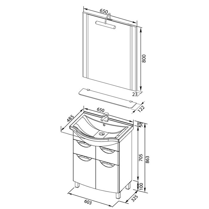 Объемные хромированные матовые ручки удобны и отлично декорируют графику фасада. Навесное зеркало с горизонтальной полкой снабжено нависающим светильником.