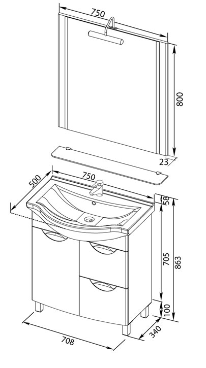 Интересным акцентом служит легкая фаянсовая раковина-столешница с изящной линией переднего края, выходящим полукругом за пределы прямоугольника тумбы. Этим она выгодно отличается от многочисленных однотипных раковин, представленных на рынке. Объемные хромированные матовые ручки удобны и отлично декорируют графику фасада. Навесное зеркало с горизонтальной полкой снабжено нависающим светильником.
