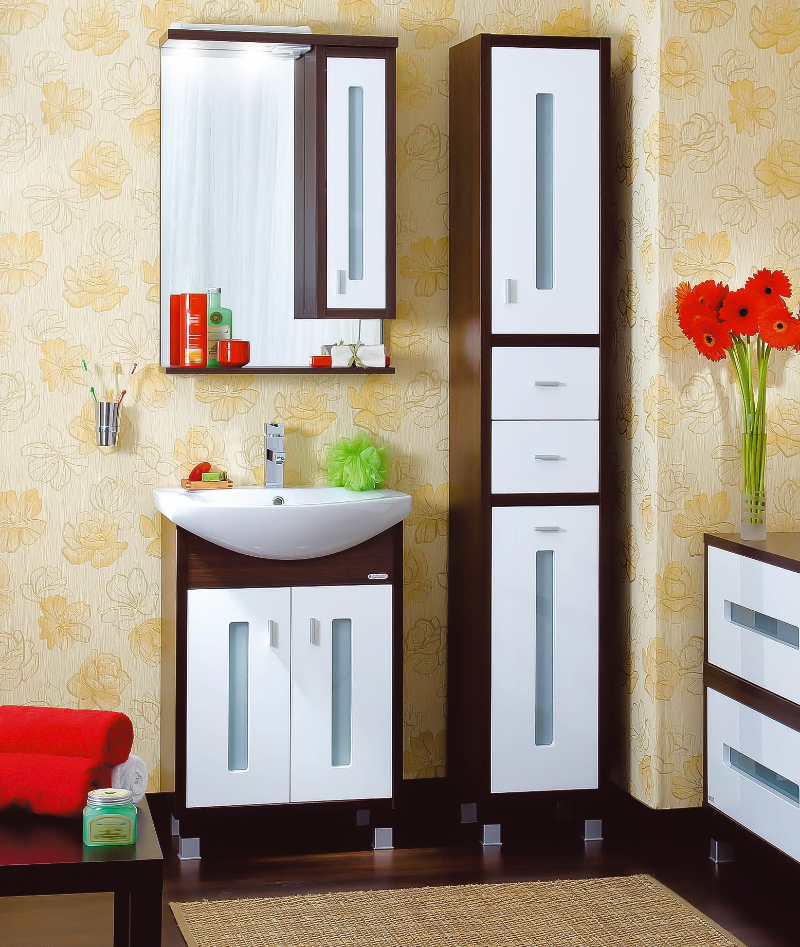 Коллекция Бали - это стильная выразительная мебель. Она будто создана на игре контрастов: темно-коричневый с белым, холод стекла и металла с теплым деревом. Яркая и функциональная, она заслужила лучшие отзывы потребителей. *Комплект мебели Бали 60 - Тумба имеет две распашные двери, за которыми располагается вместительное отделение для хранения ванных принадлежностей, разделенное полочкой. Высота тумбы указана с учетом умывальника и опор. Раковину необходимо крепить к стене. - Зеркальная полка изготавливается с правым и левым расположением шкафчика, внутри которого располагаются две полочки. На верхней планке зеркальной полки находятся два галогенных врезных светильника, каждый по 20 Ватт, которые подключены через трансформатор на 12 Вт. Рядом со светильником располагается розетка на 220 Вт. - Фасад: белый - Корпус: венге Состав комплекта: