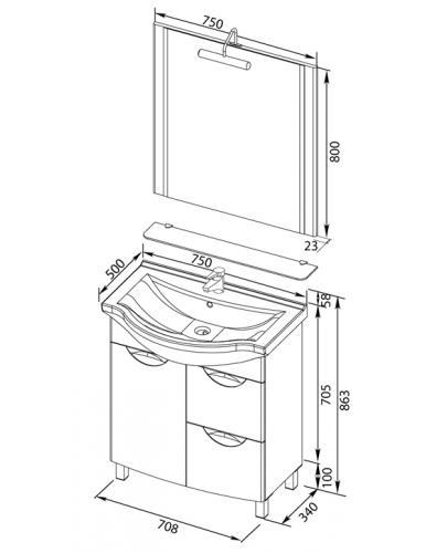 Современный и практичный комплект мебели для ванной Акванет Асти с контрастами черного и белого и удобной конструкцией с выдвижными ящиками и бельевой корзиной. Мебельный гарнитур состоит из того минимума, что делает ванную комнату по-настоящему удобной, а ее интерьер современным. Напольная тумба – это два просторных выдвижных ящика, где можно с удобством разместить необходимые бытовые средства и банные принадлежности. Здесь же – вместительная корзина на откидной дверце. Интересным акцентом служит раковина-столешница, выходящая полукругом за пределы прямоугольника тумбы. Матовые с хромированными заглушками ручки врезаны в полотно фасада. Навесное зеркало с горизонтальной полкой снабжено нависающим светильником.
