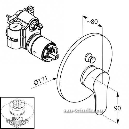 *арт. 326570575 - Смеситель для ванны и душа Kludi Objekta - однорычажный, литой рычаг - внешняя монтажная часть - функциональный элемент с керамическим катриджем - катридж с ограничителем горячей воды - автоматическое переключение душ/ванна - защита от обратного тока воды - класс расхода воды DC - класс шума I