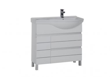 Тумба стильного набора мебели для ванной комнаты Акванет Доминика в стиле «модерн» может являться самостоятельным предметом ванной комнаты. Контраст черного и белого, оригинальные детали – ручки в виде заглубленного в фасады профиля и ритм, создаваемый горизонтальными элементами отделки – подчеркивают неординарность и экзотичность. Функциональная часть напольной тумбы представлена двумя вместительными ящиками и отделением на распашной дверце. В комплекте поставляется раковина-столешница из санфаянса. Широкая площадка у смесителя позволит разместить необходимые мелочи так, чтобы они всегда были под рукой. Дополнительно можно приобрести высокий пенал с большими секциями с дверцами и двумя открытыми полочками, а также зеркало-шкаф с распашной дверцей и светодиодной подсветкой.