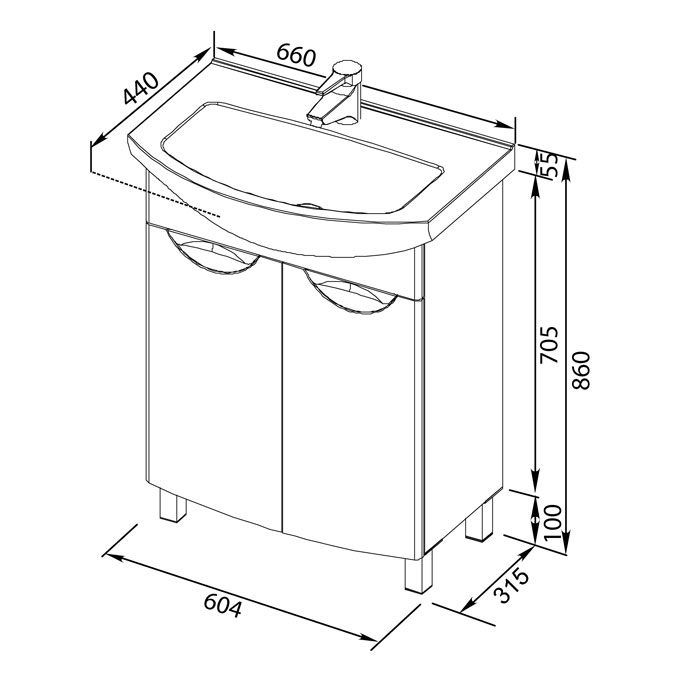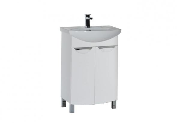 Тумба оснащена раковиной-столешницей отечественного производства Элеганс. В ней есть отверстие для смесителя и система перелива, декорированная кольцом.