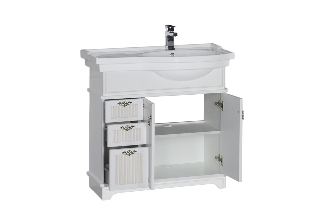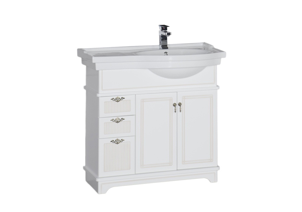 Тумба для ванной комнаты Акванет Луис 90 с правосторонней раковиной оформлена оригинальным декором, подчеркивающим геометрическую стройность и правильность композиции. Античность с ее идеальными пропорциями стала прообразом для создания этого современного осмысления классики. Вместительная напольная тумба с двумя большими отделениями и тремя компактными ящиками поможет организовать пространство ванной комнаты и создать атмосферу подлинно европейской элегантности.