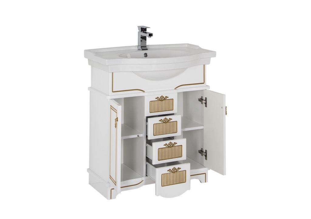 Тумба для ванной комнаты Акванет Луис 80 с оригинальным декором, подчеркивающим геометрическую стройность и правильность композиции, отражает вдохновение дизайнера – античность с ее идеальными пропорциями стала прообразом для создания этого современного осмысления классики. Вместительная напольная тумба с двумя большими отделениями и четырьмя компактными ящиками поможет организовать пространство ванной комнаты и создать атмосферу подлинно европейской элегантности.