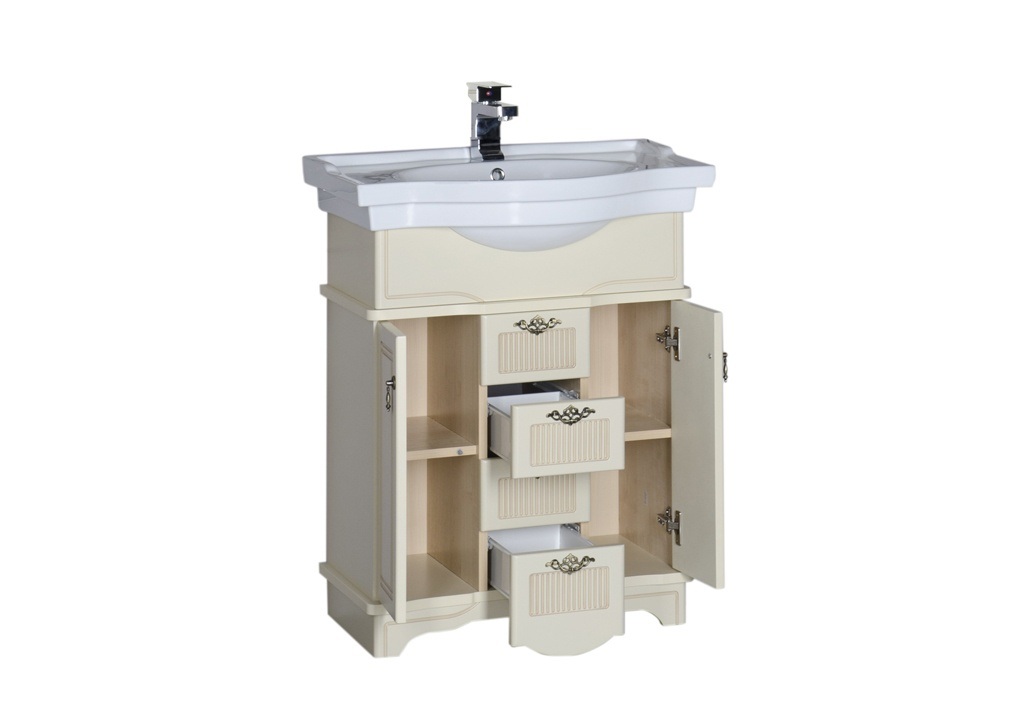 Тумба для ванной комнаты Акванет Луис 7о с оригинальным декором, подчеркивающим геометрическую стройность и правильность композиции, отражает вдохновение дизайнера – античность с ее идеальными пропорциями стала прообразом для создания этого современного осмысления классики. Вместительная напольная тумба с двумя большими отделениями за распашными дверцами и тремя компактными выдвижными ящиками по центру фасада поможет организовать пространство ванной комнаты и создать атмосферу подлинно европейской элегантности.