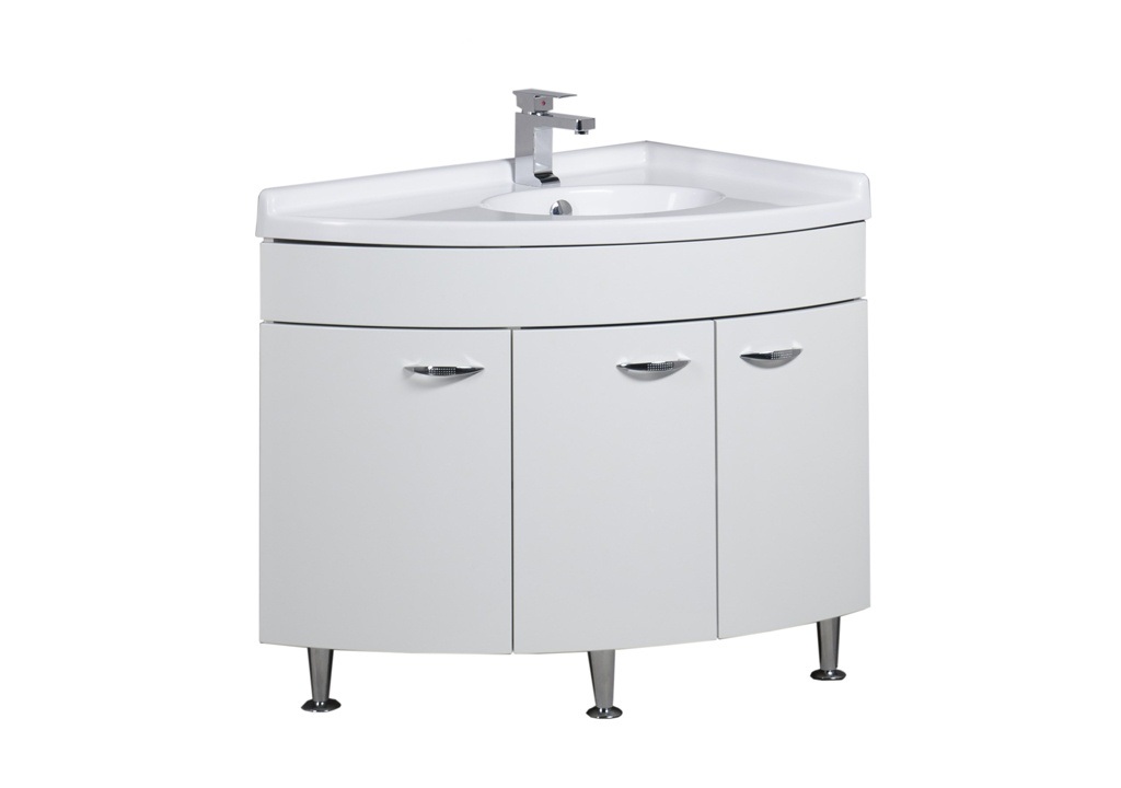 Тумба угловая Акванет Корнер уникальна своим дизайном на фоне других линеек бренда. Внешний вид этой модели проявит обладателей гарнитура как ценителей современности с хорошим вкусом. Напольная конструкция тумбы с округлой формы раковиной-столешницей снабжена отделениями полок на трех распашных дверках.