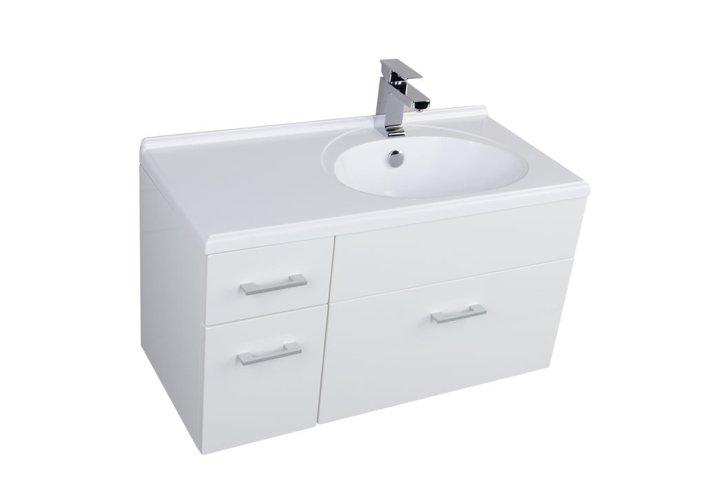 Тумба Данте для ванной комнаты в стиле модерн. Лаконичные формы, отсутствие излишнего декора и сложных деталей – вот отличительные черты современного дизайна. Навесная тумба с левым и правым шкафчиками становятся основанием для широкой раковины-столешницы. Удобные выдвижные ящики, украшенные эффектными ручками, позволят разместить все необходимые банные принадлежности.