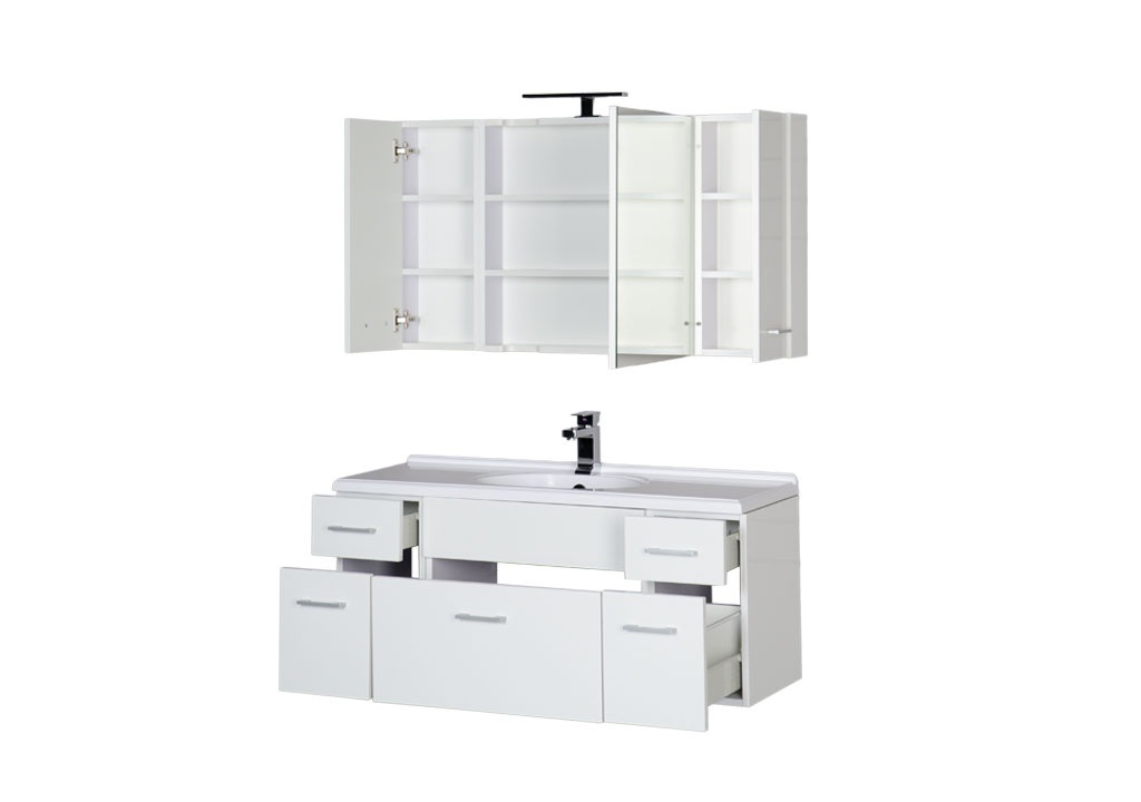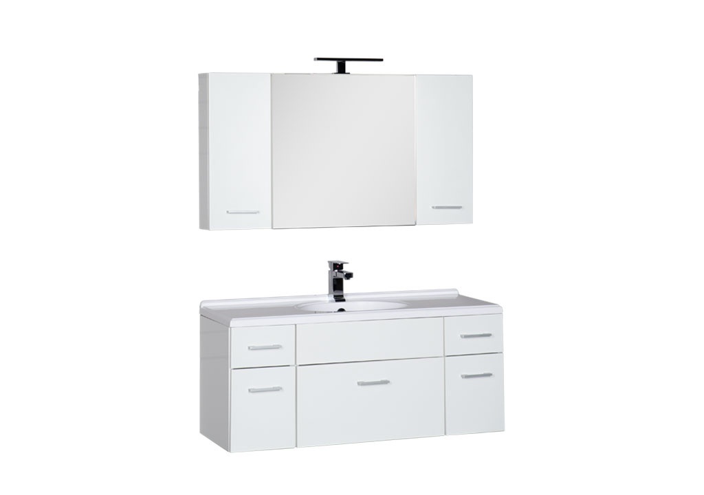 Комплект мебели для ванной комнаты Акванет Данте 110 в стиле модерн. Лаконичные формы, отсутствие излишнего декора и сложных деталей – вот отличительные черты современного дизайна. Навесная тумба служит основанием для широкой раковины-столешницы. Пять удобных ящиков, украшенных эффектными ручками, позволят разместить все необходимые банные принадлежности. Оборудованное подсветкой зеркало со скрытым шкафчиком визуально расширяет пространство и поддерживает общую стилевую концепцию своим минималистичным дизайном.