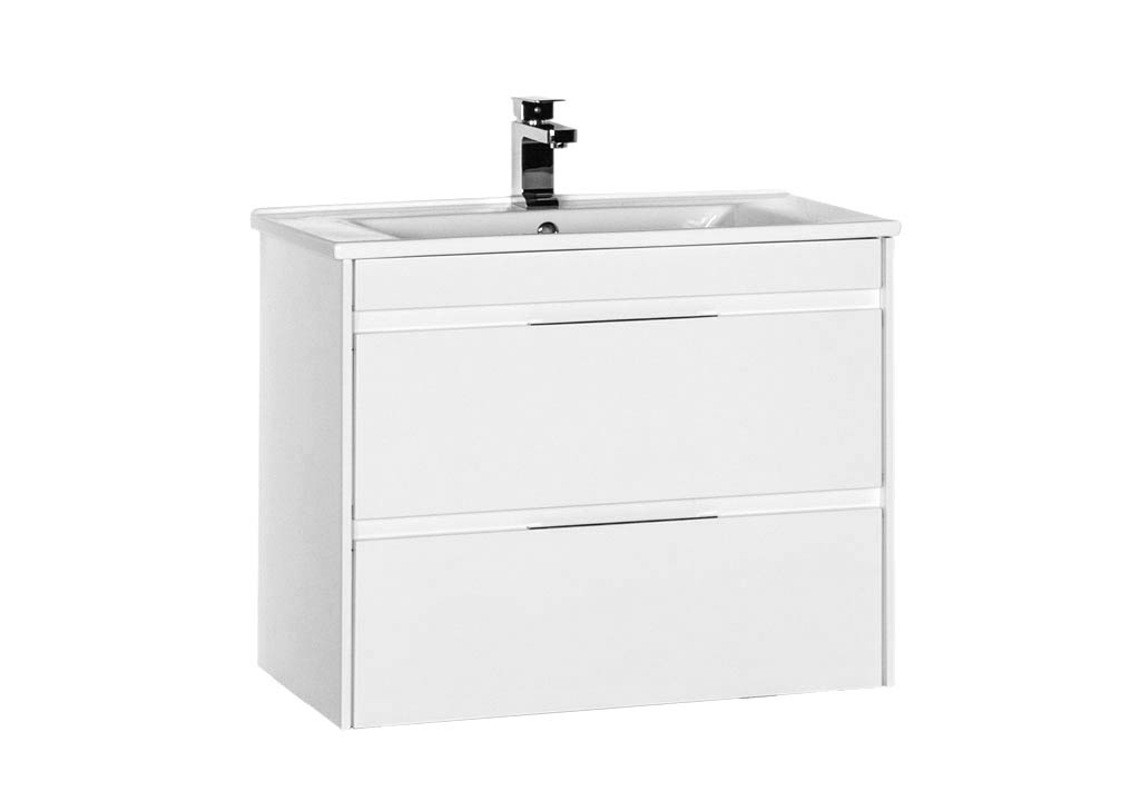 Белый цвет тумбы работает на увеличение пространства, визуально облегчает конструкцию, делает ее почти прозрачной. Раковина в этой коллекции сделана из керамики. При этом борта ее не широкие, как их чаще всего выполняют у керамических сантехнических изделий, а узкие, что выглядит утонченно и изящно.