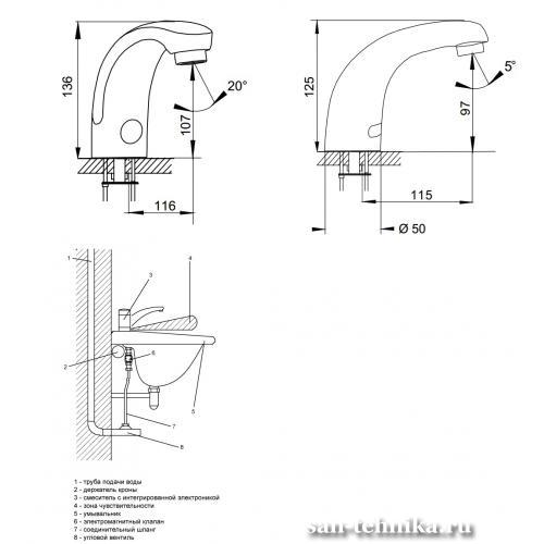 автоматическая настройка чувствительности. Реагирует на присутствие рук в чувствительной зоне до 0,3 м. от датчика немедленным пуском воды