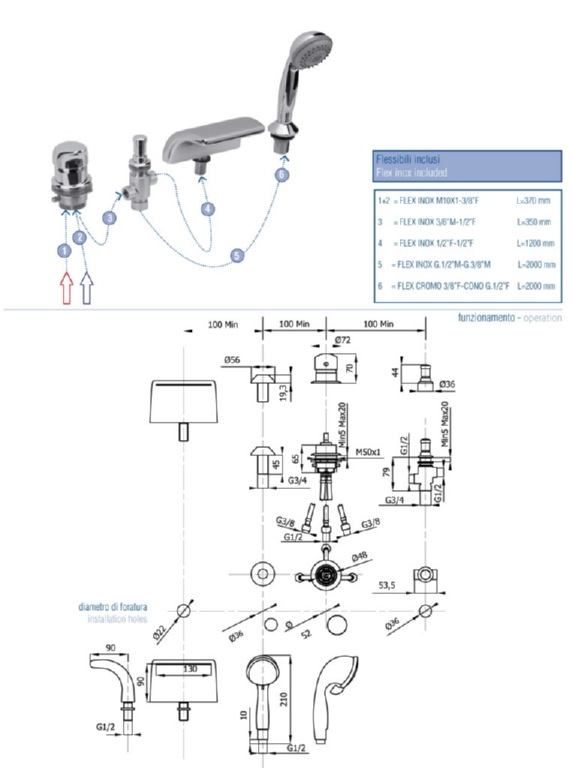 Смеситель для ванны 4-х элементный, состоит из однорычажного миксера, переключателя ванна/душ, каскадного излива и 3-х позиционной душевой лейки со шлангом, убирающимся под ванну.